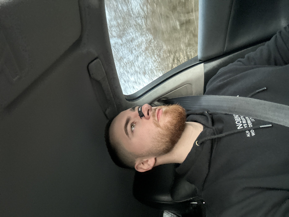 Scene: Interior of a vehicle, in transit, location specified as Stargel, Bulgaria. Subject: One male individual, appearing to be a young adult, is seated in the front passenger seat. He has a fair complexion, light-colored eyes, a short dark haircut with faded sides, and a reddish-brown, neatly trimmed beard. A black adhesive nasal strip, bearing partial white text, is horizontally affixed across the bridge of his nose. Attire: The individual is wearing a black hooded sweatshirt. White text is visible on the left chest area, partially legible as "NOBEN," "ALWAYS BELIEVE," "WONDERRFUL," and "EST." A dark gray vehicle seatbelt is fastened across his chest and lap. Actions: The individual is looking directly out the passenger side window to his right (viewer's left), observing the exterior environment. Environment: The immediate environment is the interior of a vehicle, characterized by dark gray upholstered seating and a dark gray headliner. The external view through the passenger window is significantly motion-blurred, indicating the vehicle is in transit. The blurred exterior appears to be a natural landscape, consisting of indistinct trees or vegetation under a muted, light-colored sky. No specific urban features are discernible outside the vehicle.