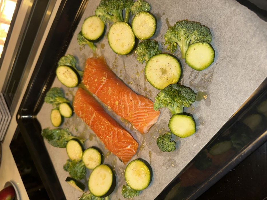 - "The image displays a close-up, high-angle view of food prepared for cooking on a black rectangular metal baking tray, which is lined with crumpled parchment paper" by FM-KRgCp1, licensed under CC BY 4.0