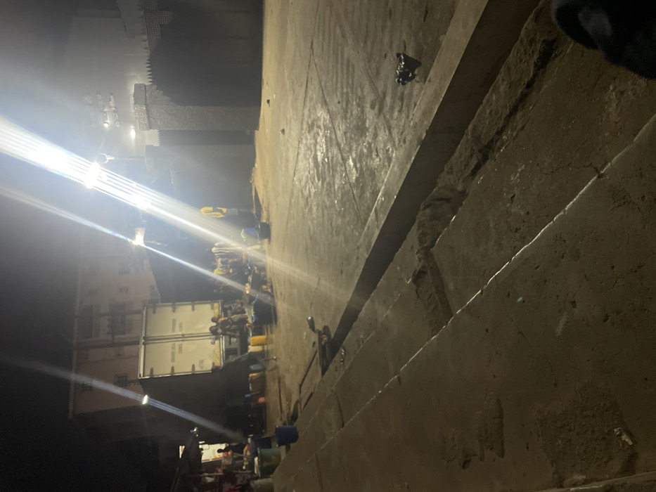 This nocturnal image captures a bustling outdoor scene in Nkpor, Nigeria, illuminated by bright artificial light sources causing prominent lens flares. In the foreground, a concrete elevated structure or steps runs diagonally from the lower-left, paralleled by an open concrete drainage channel. The ground surface is dark and appears wet or reflective in various areas, with some scattered debris. In the midground, a central activity area is present. A large white box truck, with "GOODS DELIVERED ONLY" visible on its rear door, is parked facing away from the viewer. Around the truck and extending to the right, approximately ten individuals, primarily adults, are visible. They are engaged in activities involving numerous blue and yellow plastic buckets and other containers arranged on the ground. Several people are crouched or bent over, appearing to sort or handle items from these containers. At least two individuals wear bright yellow shirts, one standing upright towards the right. The background features various structures. To the left, indistinct market stalls or smaller buildings are visible with faint outlines of more people. Centrally, behind the truck, a multi-story building with multiple windows is partially visible. To the right, a prominent, dark, and heavy-set concrete gateway with two large pillars and a metal gate structure stands as an entrance to another property. Overhead artificial lights cast intense beams across the scene, creating high contrast and obscuring some finer details due to glare.