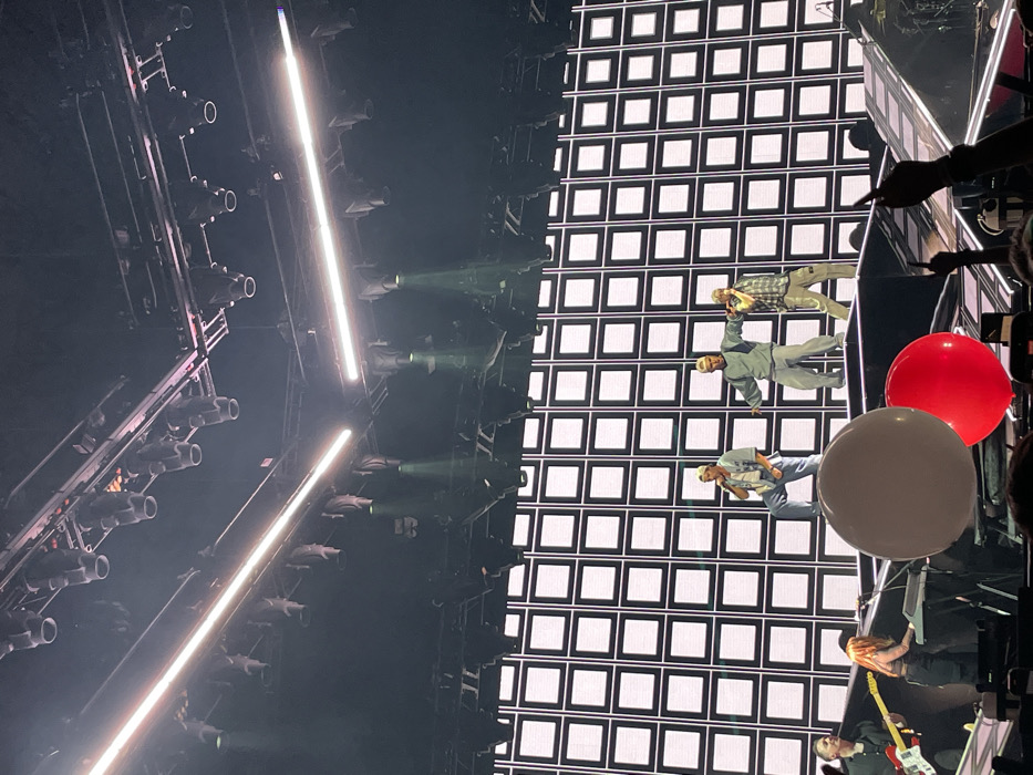 A concert stage features several performers in front of a backdrop comprised of illuminated white squares. Three singers, seemingly in casual attire, stand close together. A guitarist plays below them. To the left, stage lighting equipment is prominently displayed, with bright linear lights adding to the visual intensity. Red and white balloons partially obstruct the view of the singers, possibly held by audience members. The overall scene is energetic and vibrant.