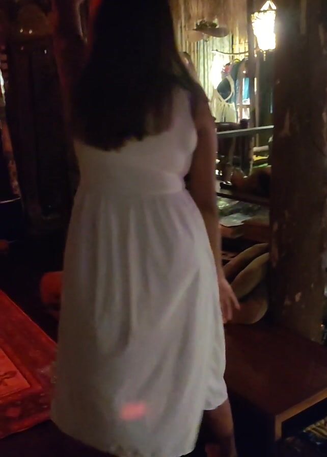 A woman in a white dress dances barefoot in a dimly lit, rustic-looking room. The room features dark wooden floors, a decorative rug, and various seating arrangements. Other people are visible in the background, and there are dim lighting fixtures. The woman moves freely with her arms raised, seemingly enjoying the music.