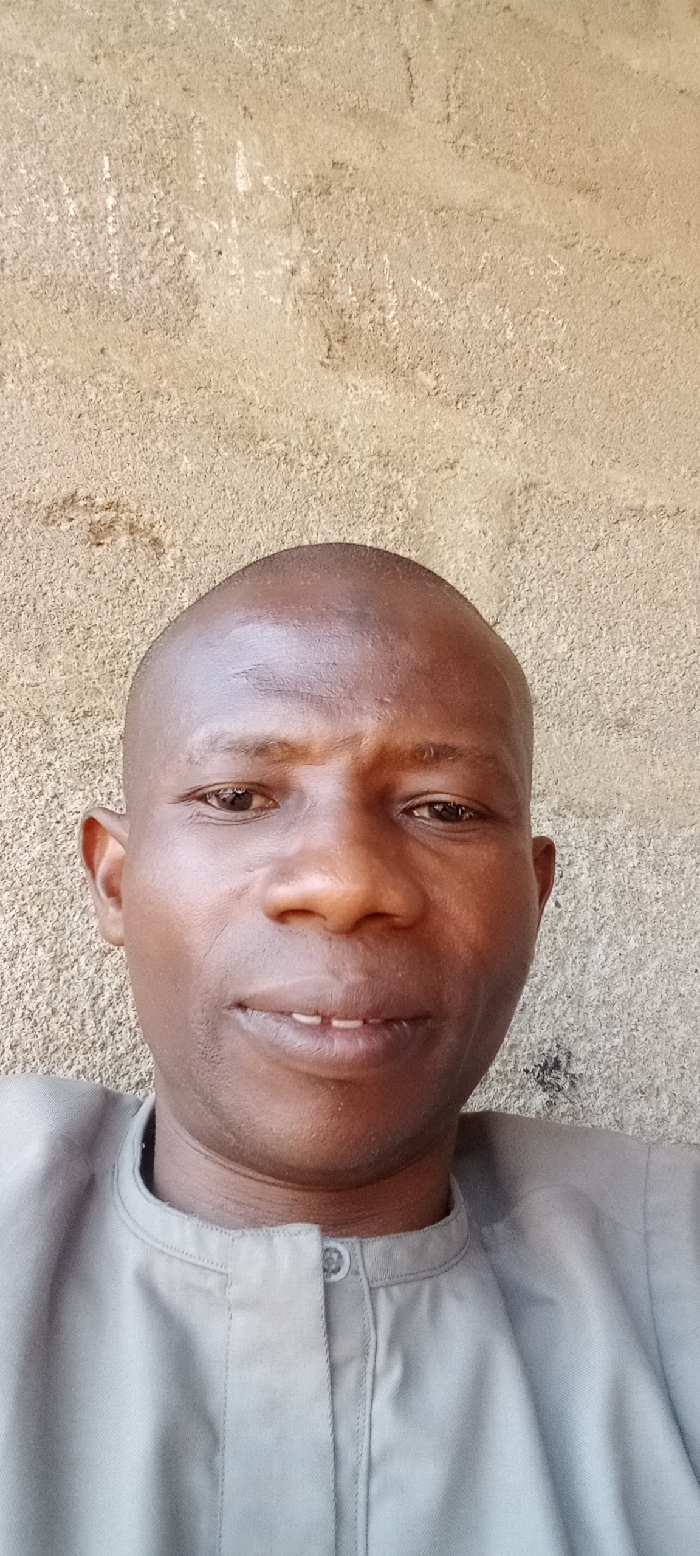 The image presents a close-up, chest-up portrait of an adult male, likely middle-aged, with dark skin and a shaved head. The subject is situated against a roughly textured, light beige concrete or stucco wall, in the city of Egbedi, Nigeria. He is wearing a light grey band-collar shirt with a partial button placket, where a single grey button is visible. The man makes direct eye contact with the camera, displaying a subtle upward curve at the corners of his mouth. The wall behind him exhibits an uneven surface texture, along with faint, indistinct marks and several localized dark brown stains.