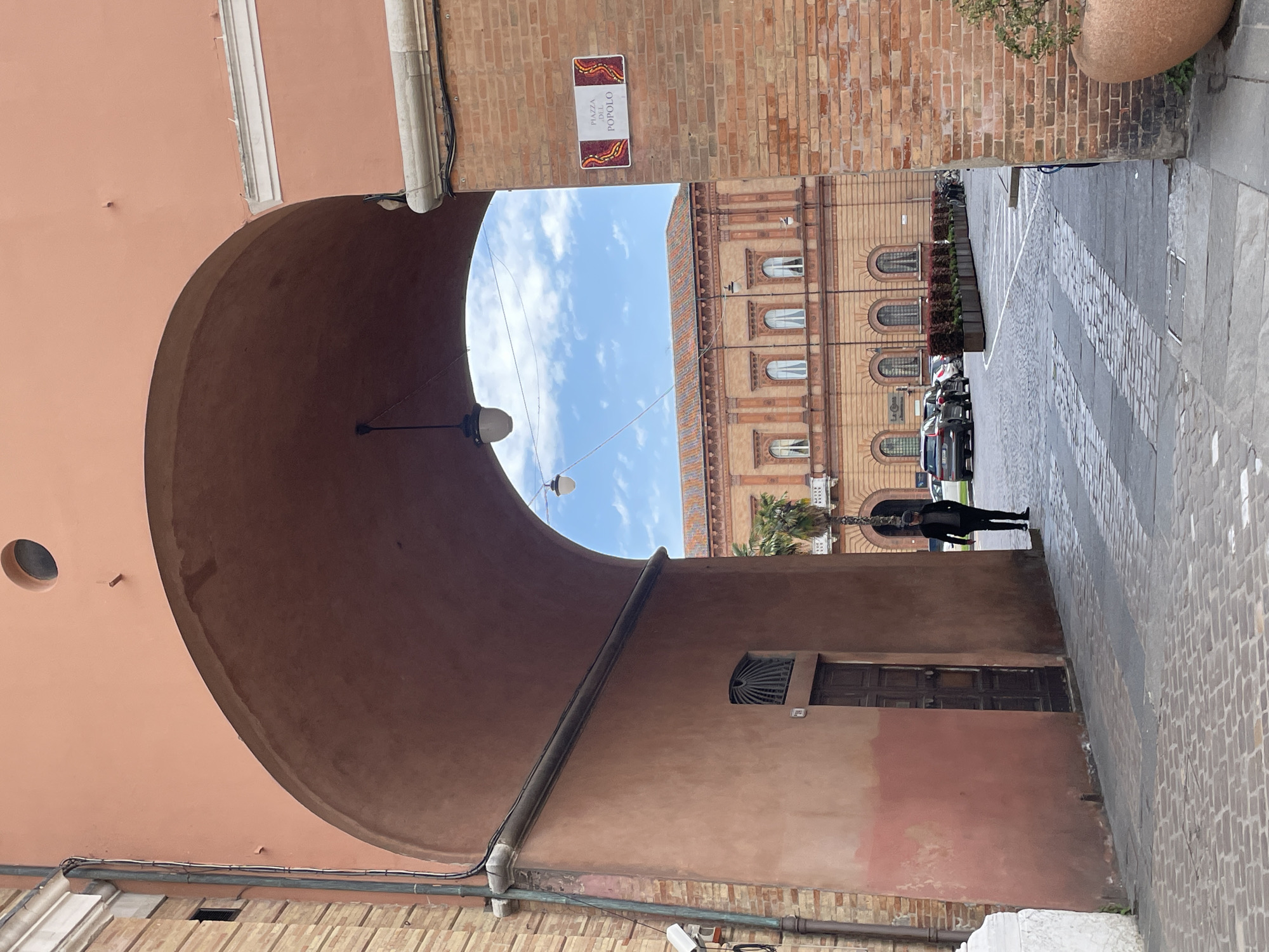The image is a view through an archway in Ravenna, Italy. The archway, built of brick and stucco, is on the left side of the image, angled away from the viewer. The ceiling of the archway is painted brown, while the side is a lighter pinkish-orange. Above the archway on the right is a sign reading "Piazza del Popolo". Beyond the archway is a street lined with buildings. The buildings on the left side of the street are made of brick and have arched windows. There are parked cars along the street. A person in dark clothing is walking on the sidewalk in the distance. The street is paved with cobblestones. The sky is visible through the archway and is blue with scattered clouds.