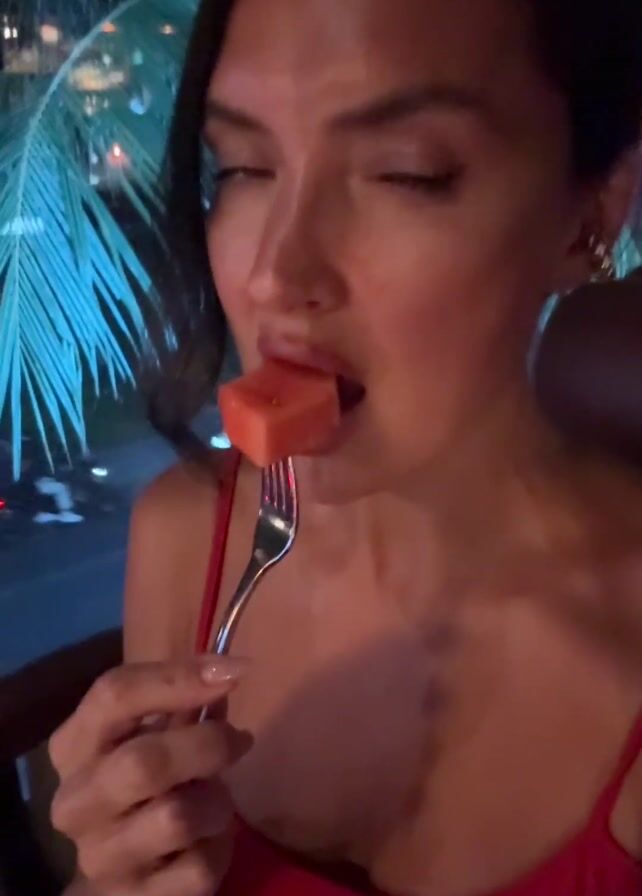 A woman in a red top is shown eating a slice of watermelon with a fork. She is looking at the camera and pouting. Behind her, through a window, is a palm tree and a lit-up sign. It appears to be night. She is seated at a table.