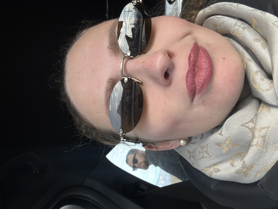 A female is depicted in a close-up, self-portrait perspective, cropped from the upper chest. She wears oval, mirrored sunglasses that reflect a distant snow-capped mountain range under a partly cloudy sky, with a commercial or industrial area featuring multiple buildings and parked vehicles in the foreground. Her lips are covered in light pink lipstick, and a single pearl earring is visible on her left earlobe. She wears a light-colored scarf with a repeating, recognizable monogram pattern, underneath a dark outer garment. In the background, partially visible through a vehicle window to the left of the female, a bearded male wearing dark sunglasses is present, looking towards the left of the frame. The scene is set within a vehicle interior, indicated by the dark headliner visible at the top. The reflected and visible external environment includes mountainous terrain and a developed area consistent with a roadside or commercial location. This scene is situated in Saint-Jeoire-Prieuré, France.