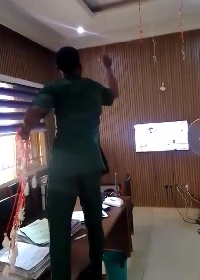 A man in a green outfit stands on a desk, decorating a room. He is hanging red and white streamers from the ceiling. The room has wood-paneled walls, a window with blinds, a television showing a scene with people in it, and an electric fan. There are papers and other items on the desk. The ceiling has recessed lighting.