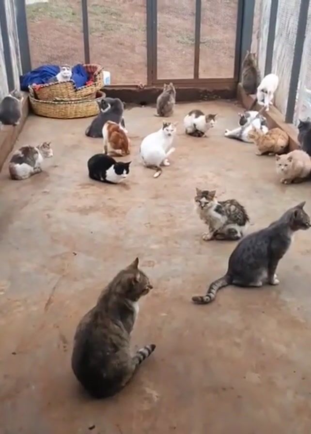 large number of cats, maybe twenty or more, in an enclosed space resembling a sunroom or large cage. The cats are of various colors and patterns. Some are sitting, some are lying down, and some are looking around. The enclosure has a concrete floor and is surrounded by a metal frame with wire mesh or glass panels. A basket with blue items in it sits in the corner of the room. A "meow" sound is heard.