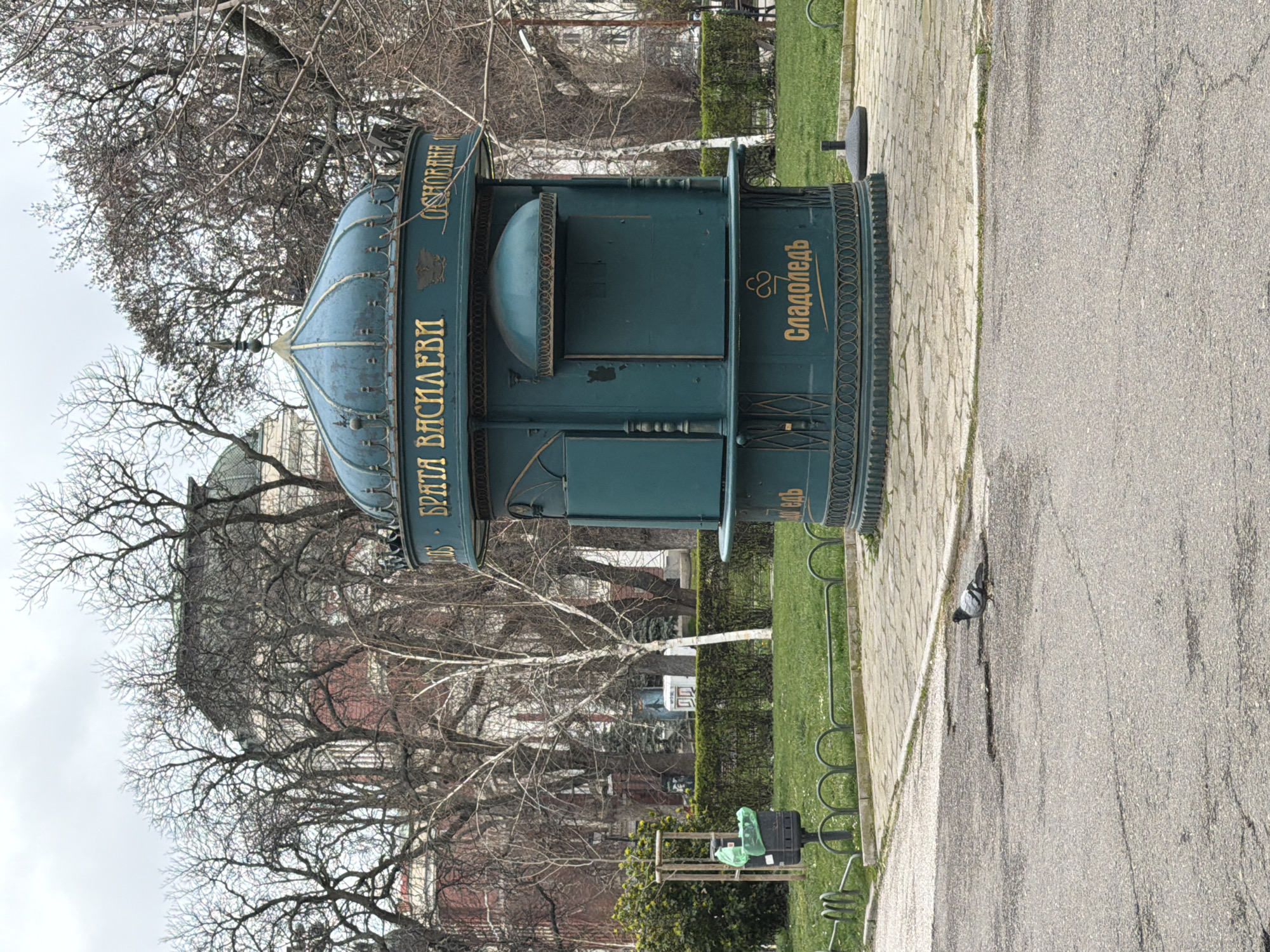 blue kiosk labeled "Сладолед" in Cyrillic, meaning "Ice Cream," standing in a park or pedestrian area. The kiosk has a decorative design with gold lettering and ornate metalwork. The address on the kiosk is "Brata Vasilevi" and "Osnovanie". In the background are bare trees and a glimpse of a building with a dome. A pigeon stands on the pavement next to the kiosk. The scene is likely in Sofia, Bulgaria, where these kiosks are common.