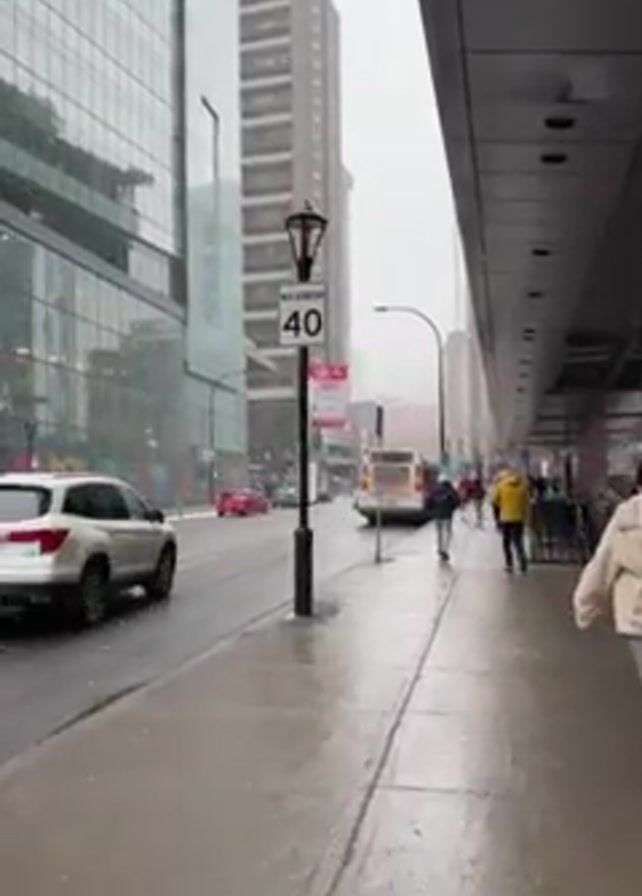 city street on a snowy day. The sidewalk is wet. People walk along the sidewalk, some with umbrellas or wearing rain gear. Cars and a bus drive on the street. Buildings of varying heights line the street. A street sign indicates a maximum speed limit of 40. Snowflakes are visible in the air.