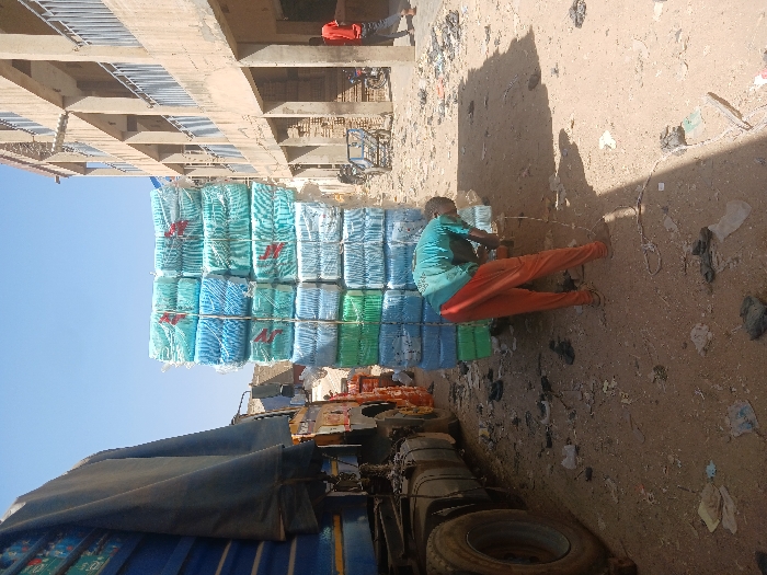 The image depicts an outdoor commercial scene in Fagge A, Nigeria, under clear daylight. A large blue truck with a grey tarp covering its cargo area is parked on the left. Adjacent to the truck, a tall, rectangular stack of approximately 20-25 bundled items, primarily light blue and green, wrapped in clear plastic, occupies the central frame. The bundles are secured with visible red and white strapping. In the foreground, a male individual wearing a teal long-sleeved shirt and orange-red pants is bending over at the base of the stacked bundles, appearing to secure or manipulate a white rope on the dirt ground near the truck's rear tires. The ground is unpaved, consisting of packed dirt heavily littered with various debris including plastic bags, paper, and fabric scraps. On the right side of the frame, a three-story building constructed of light brown concrete features multiple balconies with silver metal railings. Towards the right background, another male individual in a red shirt and dark pants walks away from the camera, moving towards the right side of the building. Several parked motorcycles or bicycles are visible near the building's base. The sky above is clear blue, and shadows are cast on the ground from the right, indicating bright sunlight.