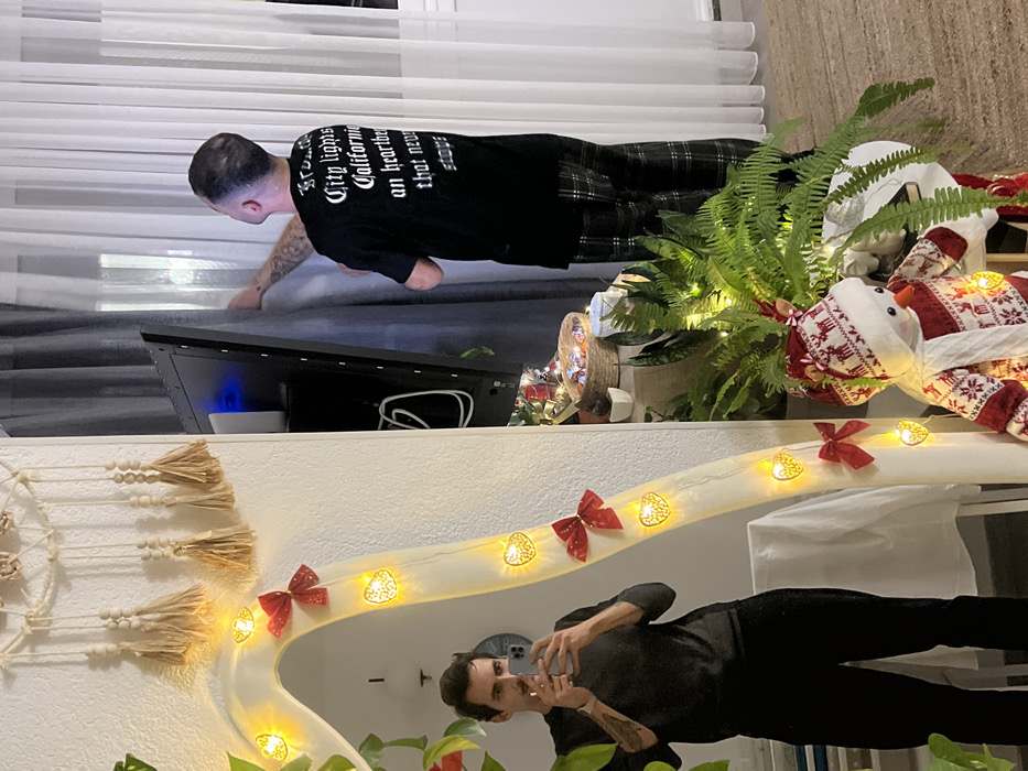 A man in a black t-shirt and plaid pants is shown next to a TV. The shirt says "City Lights California an heart that never stops." He has tattoos on his arm. In the lower portion, another man in a black sweater and pants is reflected in a mirror decorated with string lights and red bows. Plants are at the bottom. A snowman and other Christmas decorations are placed above the mirror. There is a dreamcatcher on the wall to the left.