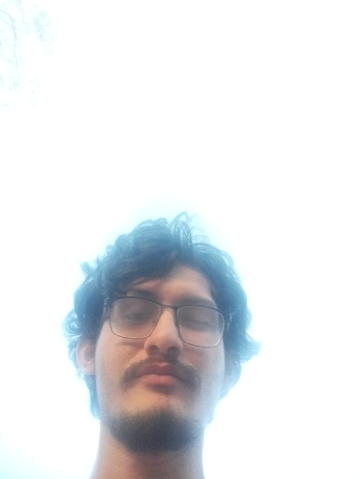 A person's face is centered in the image. They have dark, curly hair and wear rectangular glasses. Their eyes are closed or barely open. A mustache and a short beard are visible. The background is bright and washed out, obscuring details. The overall lighting is harsh. The image seems to be taken from a low angle, looking upwards at the person.