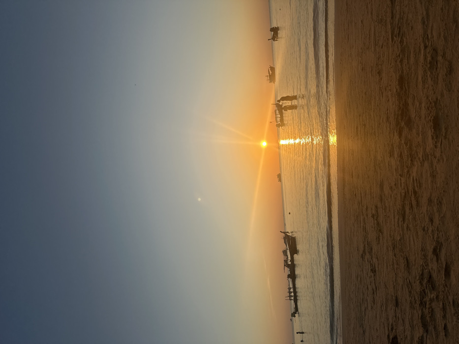 The image displays a coastal scene in Tambon Ko Tao, Thailand, during what appears to be sunset. The sky transitions from a deep blue at the top to an orange and yellow gradient near the horizon. The sun, a bright orange disc, is positioned low on the horizon, emitting distinct radial light rays that stretch upwards and create a prominent reflection path across the water's surface towards the viewer. The foreground consists of light brown sand with minimal texture. The water, a body of ocean or sea, is calm with small ripples at the waterline. Multiple longtail boats are present in the water, appearing as dark silhouettes against the brightly lit horizon. A large longtail boat is visible in the mid-left, with at least five other boats of varying sizes distributed across the water towards the right. Two human figures are standing in the shallow water towards the center-right, appearing as dark silhouettes due to backlighting, with water reaching approximately their waist. A third human figure is partially visible on the far left in the water. The overall scene is characterized by the strong, warm illumination from the low-lying sun.