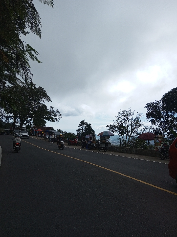 The image depicts an outdoor scene on a paved road overlooking a city, identified as Phoxay, Laos. The perspective is from the roadside, looking down a slight incline or curve to the right. The road surface is dark asphalt with a single solid yellow center line. On the road, a white sedan is visible parked or moving slowly on the left side, near the curb, with additional vehicles partially obscured behind it. Two motorcycles are in motion: one in the foreground, traveling away from the viewer, and another further ahead, traveling in the same direction, with its rider wearing a yellow helmet. To the left of the road, dark green foliage from trees extends into the upper left quadrant, creating a canopy effect. Along the right side of the road, a low, light-colored stone wall delineates the edge, beyond which the landscape drops off, revealing a distant cityscape or town with scattered buildings. Several informal vendor stalls are set up along the right shoulder of the road, next to the wall. One prominent stall features a striped umbrella (white, grey, light blue) and a metal cart underneath. Another stall further right has a red umbrella. People are visible near these stalls and along the roadside, some appearing to be vendors or customers. Parked motorcycles are also present near the stalls. The sky is heavily overcast with significant cloud cover, exhibiting various shades of grey and white, with brighter patches indicating obscured sunlight. The overall lighting is diffuse.