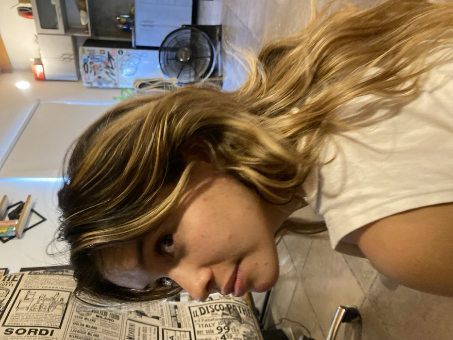 A close-up portrait features a young woman with blonde hair and fair skin. She is wearing a white t-shirt. The background includes a newspaper-printed chair, a floor fan, kitchen cabinets, and other household items. The photograph is slightly tilted, drawing attention to the subject's face and hair. The text "IL DISCO PATHE ITALY" is visible on the chair.