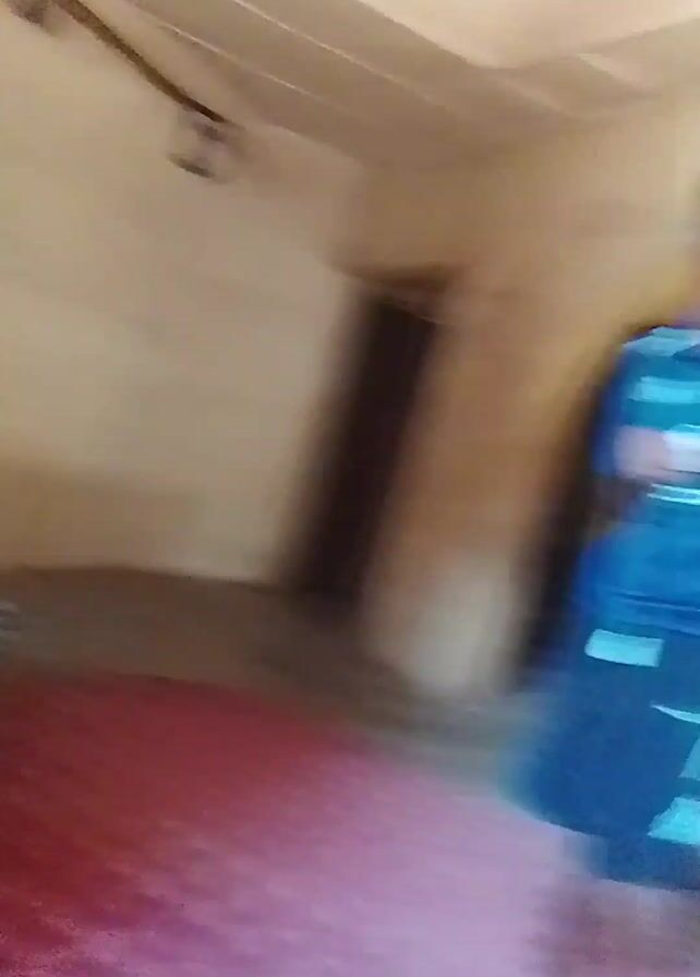 Here is a detailed description of the video: The video shows two young people in a room with old furnishings and a red patterned carpet. One person is wearing a blue soccer jersey and black shorts, and the other is wearing a dark top and white shorts with their hair braided. They appear to be play-fighting or shadow-boxing, moving around the room and laughing. The room has a low ceiling, plain walls, and an arched doorway. An old striped armchair sits in the background. The lighting is natural and the image is slightly blurry.