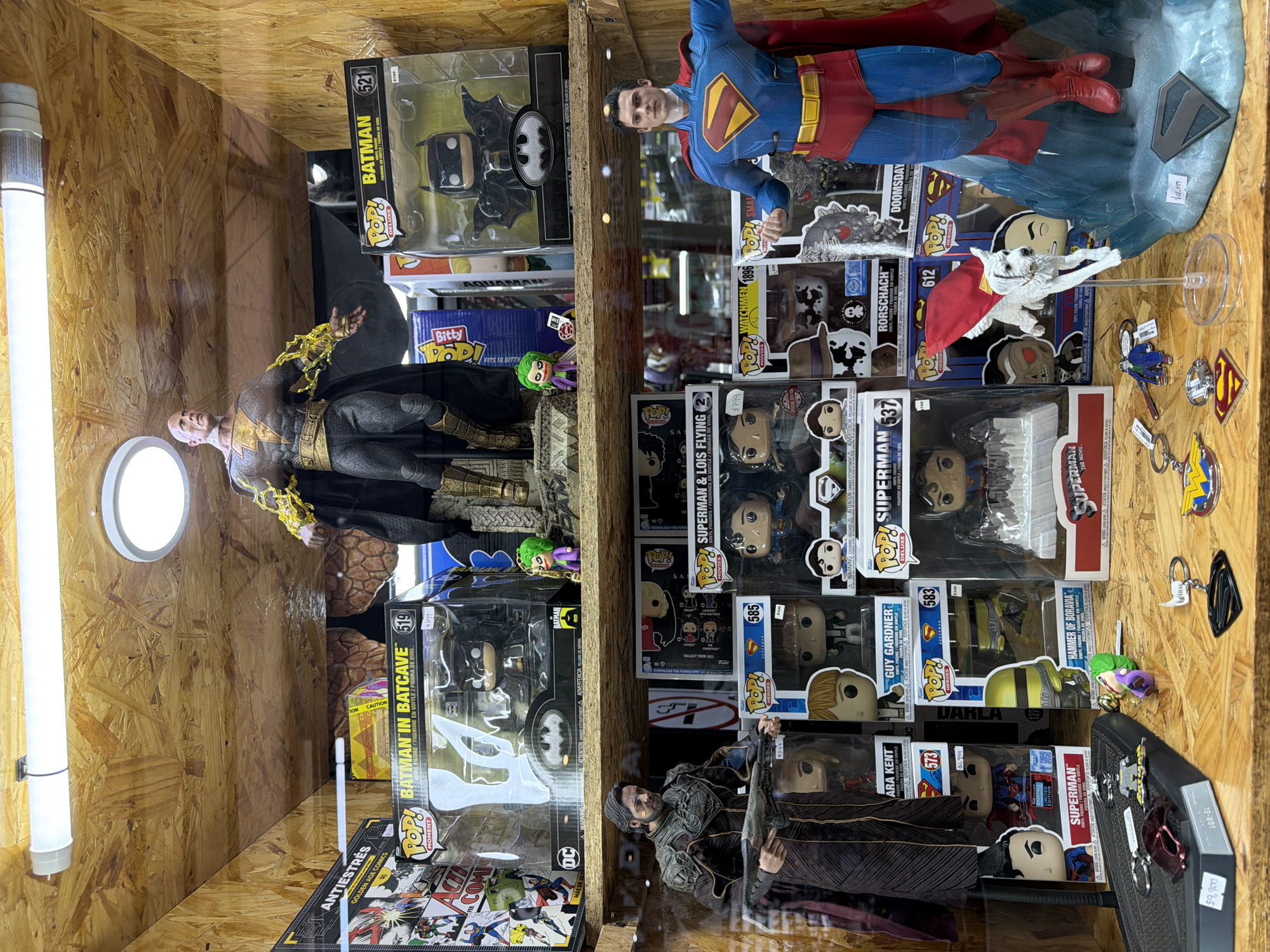 A display cabinet in San Pedro Cholula, Mexico, is filled with a collection of superhero figurines and collectibles. The cabinet is made of light-colored wood and illuminated by a fluorescent light. On the left side, there are Batman-themed items, including action figures in packaging labeled "Batman in Batcave," and a large Black Adam figure. On the right side, a Superman figurine is positioned above a stack of Funko Pop figures, including ones featuring Superman, Lois, Guy Gardner, and other DC characters. There are keychains and other Superman-themed accessories displayed on the right. The figurines are arranged on shelves within the cabinet. The style of the room the cabinet sits in is old and simple.