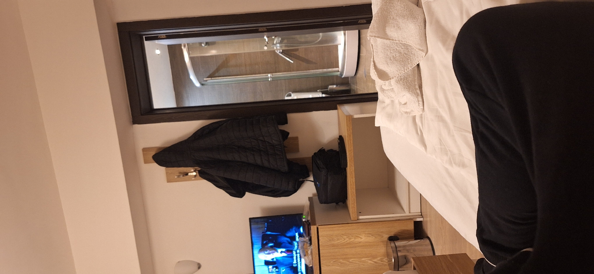 The image displays an indoor scene within a room in the city of Dedovo, Bulgaria, observed from a low vantage point on a bed. The bed is furnished with white sheets, and a white, textured towel is positioned on its surface. The legs of an individual, clad in black pants, are visible in the immediate foreground, resting on the bed. To the left, a television screen displays a man in a suit, with Cyrillic text visible as subtitles at the bottom. The television is situated on a light wood-toned cabinet. A black quilted jacket hangs from a wooden coat rack on the wall to the right of the television. Below the jacket, a black bag and a black strap are placed on a low, open-shelved unit with a light wood top and white sides. To the right, an open doorway with a dark frame reveals a bathroom. Within the bathroom, a curved glass shower cabin with a white base, a showerhead, and a partially visible toilet are discernible. The bathroom walls appear to be covered with brownish-grey tiles. A small, light-colored trash can is visible on the bathroom floor. A chrome trash can is present on the main room's floor beside the television cabinet. A wall-mounted light fixture is visible on the left wall.