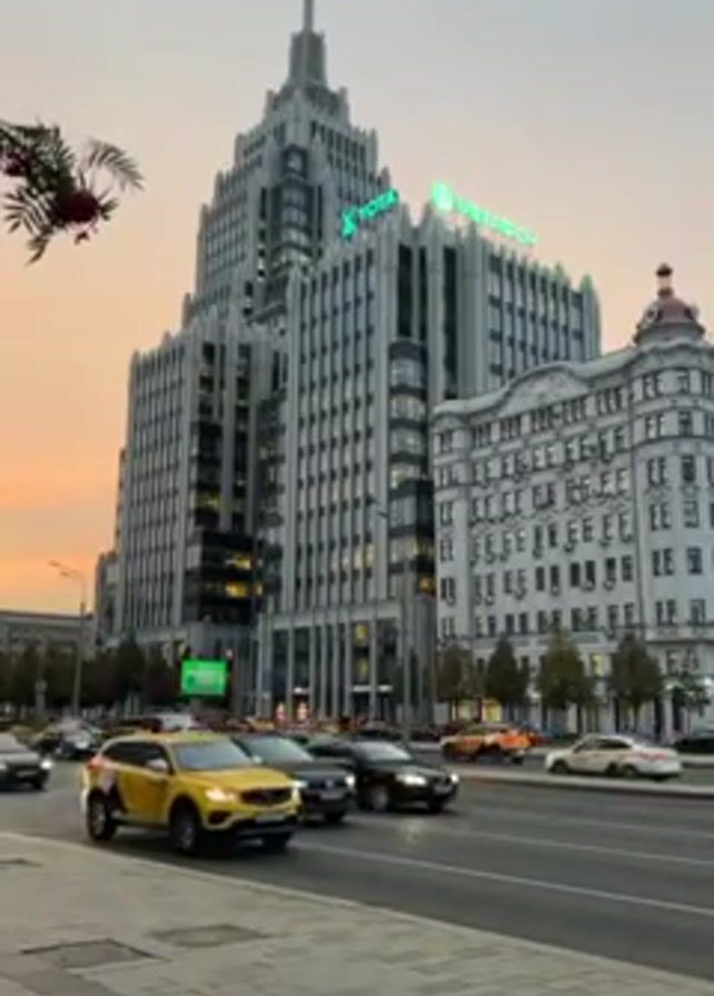 street scene in an urban area. A tall building, possibly an office building or skyscraper, is prominently featured. It has a distinctive architectural style, with multiple levels and a pointed top. The building displays signage that includes the words "Yota" and "Megafon." Traffic is flowing on the street in front of the building, including cars of various makes and models. Some of the cars are identifiable as taxis due to their yellow color and taxi markings. Another building with a different, more classical architectural style is visible to the right of the tall building. The sky is tinted with colors of dusk or dawn, suggesting the video was taken during twilight hours. The street is lined with a sidewalk and what appears to be a curb or barrier separating the pedestrian area from the road. There are trees sparsely planted along the sidewalk.