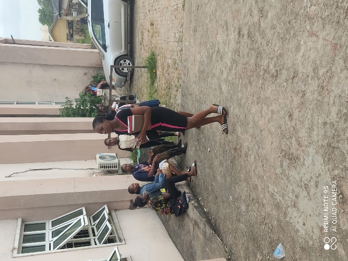 A group of seven young adults stand outside a tan building with open windows and an air conditioner. A woman in a black dress with pink stripes holds a book. A silver car is parked near the building. The ground is concrete. The photo was taken with a Redmi Note 9S AI Quad Camera.