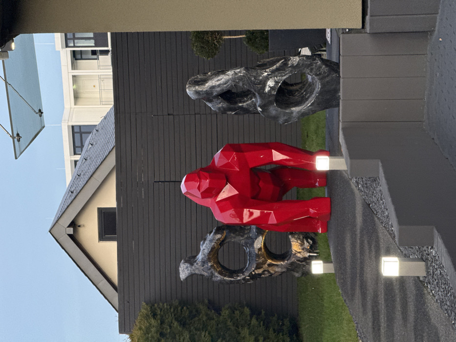 A red, geometric gorilla statue is centered in the frame, positioned between two abstract sculptures with hole-like designs. A grey wooden building serves as a backdrop. To the left, a building with a sloped roof and a neighboring white structure are visible against a blue sky. On the right, are steps constructed from light grey paving with integrated small lights. At the bottom, greenery and grass blend into the foreground.
