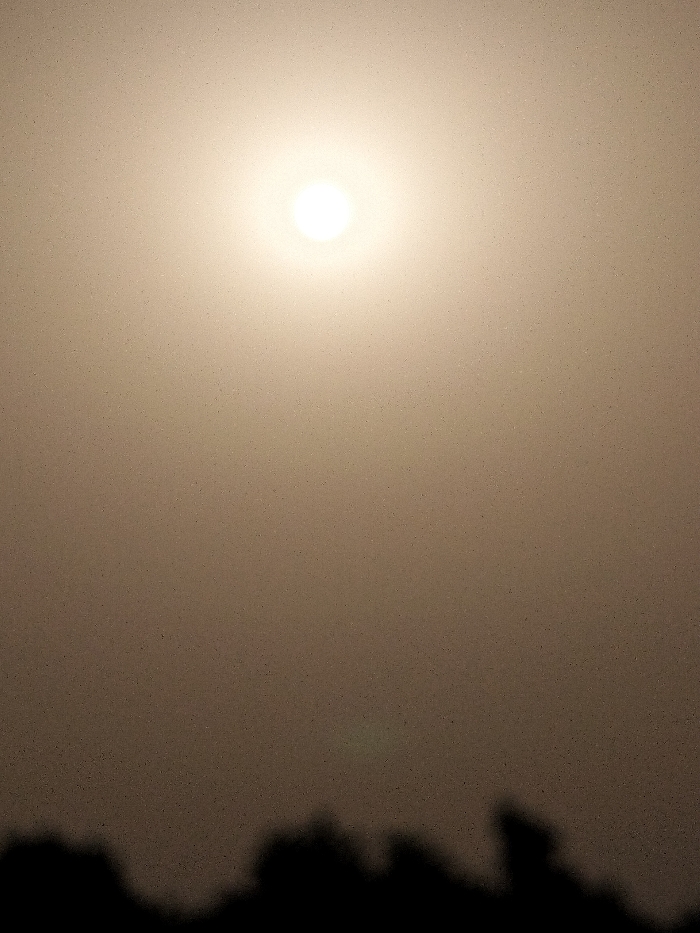 A hazy image shows a bright sun high in the sky, obscured by a thick layer of dust or fog