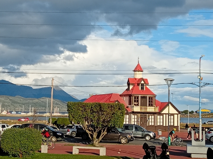 A two-story building with a red roof and white and brown trim stands prominently. Vehicles and pedestrians are on a street in front. Trees and a grassy area are in the foreground, adding depth. In the background, there is a body of water with sailboats and mountains under a partly cloudy sky. Power lines cross the upper part of the image.