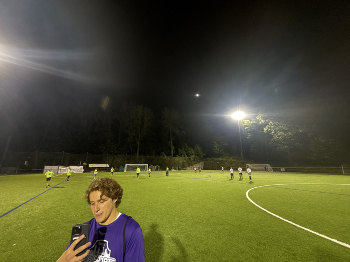 The image displays an artificial turf sports field at night, illuminated by multiple stadium lights and a visible crescent moon in a dark sky. In the foreground, a young male with wavy brown hair, wearing a purple long-sleeved shirt displaying "SPORTS" branding, holds a dark smartphone in his left hand, looking at its screen. In the midground, approximately 10-15 individuals are distributed across the green field, some wearing bright yellow/lime green pinnies and others wearing white shirts, engaged in what appears to be a soccer practice or game. Two white soccer goals are visible in the background. The field is bordered by a dark treeline and a fence. The specific location within Newton, United States, is not discernible from the image.