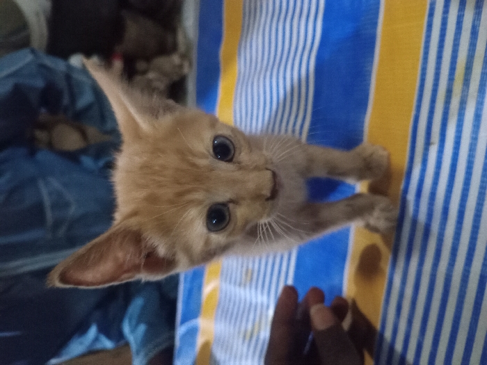 An orange kitten stares upward with curious eyes. It stands on a striped bedspread of blue, white, and yellow. Its paws rest on the fabric as it gazes at the viewer. A dark hand reaches towards the kitten, possibly in an attempt to pet it. The background shows a blue blanket and blurred shapes.