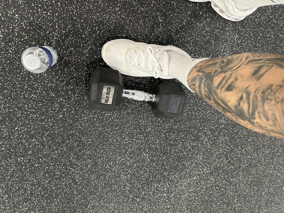 An overhead view captures a section of a gym floor, characterized by dark grey rubberized matting speckled with white. Centrally positioned is a black, hexagonal dumbbell, bearing the "BLK BOX" brand on one end and "12.5" (kilograms) on the other. A small, clear plastic water bottle with a blue label lies to the upper right of the dumbbell. The lower right portion of the frame shows a person's lower right leg and foot, clad in a white athletic shoe with white laces and a white sock. The exposed skin of the lower leg is heavily tattooed with intricate black and grey imagery, depicting what appear to be figures or faces. A partial view of a second white shoe is visible at the extreme right edge. The specific location within Dunfermline, United Kingdom, cannot be identified from visual cues in the image.