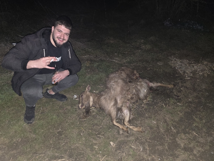 This image captures a nighttime outdoor scene in Cherven Bryag, Bulgaria. A male individual, appearing to be in his 20s or 30s with dark hair and a beard, is positioned in a crouch on the left side of the frame, smiling towards the viewer. He is dressed in a dark jacket, dark t-shirt, grey sweatpants, and black athletic shoes. His right hand holds a brown glass bottle, while his left hand holds a lit cigarette, with his index and pinky fingers extended. To his right, occupying the center and right foreground, lies a deceased deer-like animal, consistent with a roe deer, on its left side. The animal's fur appears matted and disheveled, and its head is visible, facing left. The ground consists of sparse grass and bare dirt. The background is dark and indistinct, showing faint outlines of vegetation and ground clutter. The scene is illuminated by an apparent camera flash.