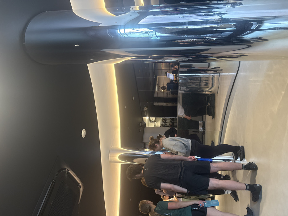 The image depicts the interior of a modern fitness studio, identified as Rise 'n Shine in Antwerp, Belgium. The scene is characterized by a sleek, minimalist aesthetic featuring a dark grey/black ceiling, a light, polished floor, and prominent reflective surfaces. Two large, curved, chrome-finished pillars are visible, one partially on the left and a dominant one on the right, which distorts reflections of the interior and an external view through a window. A curved section of the ceiling is illuminated by a continuous warm yellow LED strip light, complemented by recessed spotlights. An air conditioning unit is mounted on the dark ceiling in the upper left. Approximately 6-8 individuals, predominantly young adults in athletic attire, occupy the foreground and mid-ground. From left to right: * A female in a dark green t-shirt and dark shorts holds a light blue water bottle. * A male in a black t-shirt, black shorts, and black cycling shoes stands centrally, facing away from the camera, holding a blue object. * A female with blonde hair tied in a bun, wearing a light grey long-sleeved top, dark leggings, and black cycling shoes, stands facing towards the right. The individuals appear to be standing and conversing in a common area. In the mid-ground, a reflective, curvilinear reception counter is visible. Behind this counter, two individuals are present; one is partially obscured, and another appears to be seated or standing low, operating a computer or tablet. Behind the counter, a wall with shelves displays rows of athletic footwear, likely cycling shoes. The overall activity suggests a pre- or post-workout gathering in the studio's reception or waiting area.
