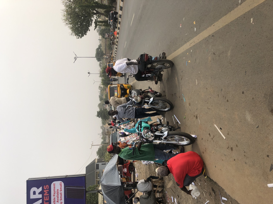 This image captures a roadside scene in Karu, Nigeria, under a hazy, light-colored sky