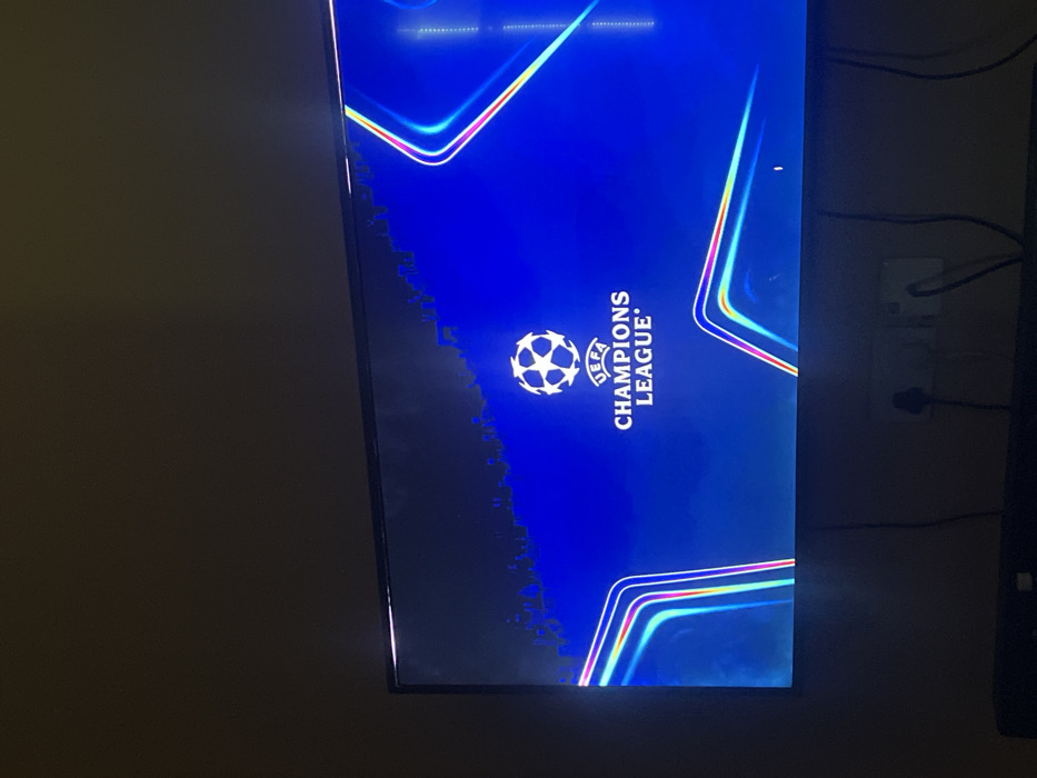 A television screen displays the UEFA Champions League logo against a blue background with light streaks. The TV is mounted on a wall, with electrical outlets and cables visible on the right side. The left side of the image shows a portion of the wall next to the TV. The image appears to be captured in a dimly lit room.