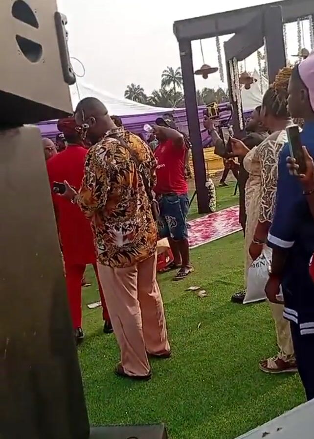 crowd of people at an outdoor event on a grassy area. Many are holding up phones, likely taking pictures or videos. Some people are wearing red shirts. There's a DJ booth in the foreground with a large speaker. In the background, there's a decorative structure and a white tent. There are wads of cash on the ground near the people wearing red.