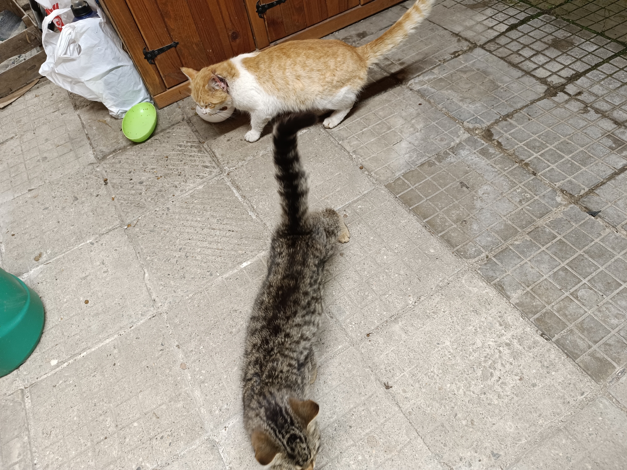 - "A tabby cat stretches beneath an orange and white cat eating from a white bowl on a concrete-tiled floor" by FM-8ohQr1, licensed under CC BY 4.0