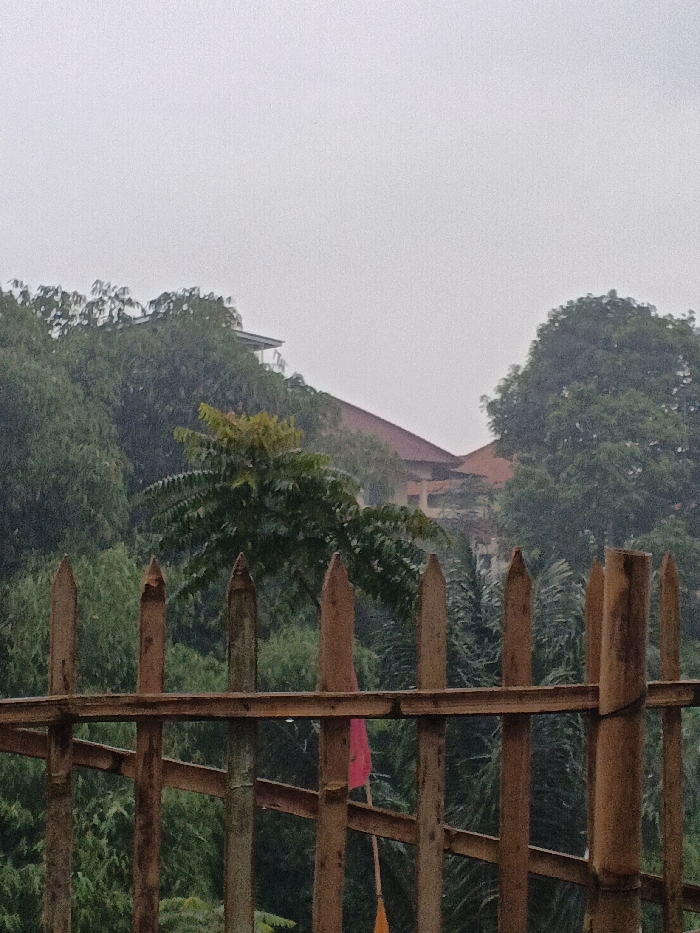 A wooden fence dominates the foreground, its vertical posts sharpened to points, and horizontal supports creating a grid. Behind the fence, lush greenery fills the frame, partially obscuring a multi-story building with a reddish roof. The scene is shrouded in overcast conditions, with a heavy, grey sky. A glimpse of a red flag or cloth is visible amidst the greenery behind the fence.