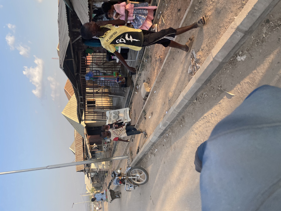 The image depicts a street scene in Ajaokuta, Nigeria, under a clear blue sky with sparse white clouds and warm, low-angle sunlight
