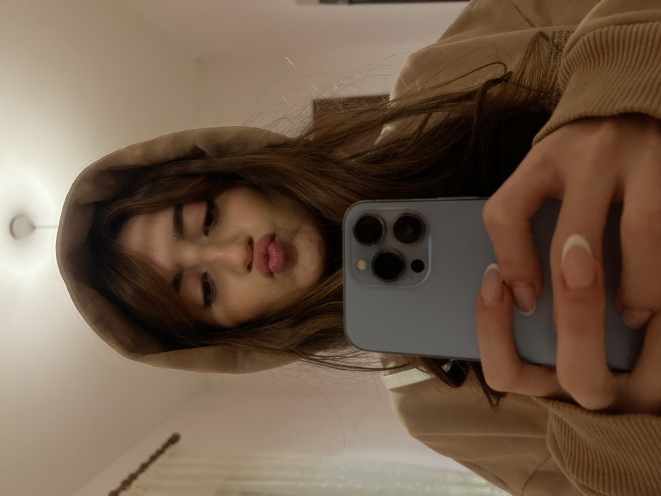 - "A young female with long brown hair and bangs, wearing a light brown hooded sweatshirt with the hood up, is depicted taking a selfie indoors" by FM-c63o33, licensed under CC BY 4.0