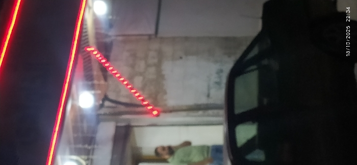The image depicts a nighttime urban scene in Al-Kiswa, Syria, dated 18/10/2025 at 22:34. A dark-colored vehicle, possibly a sedan, occupies the lower foreground, presenting its roofline and windows from the front passenger side. In the midground, to the left, a bearded male wearing a light green shirt and blue jeans stands in an open doorway or recessed area, holding a dark object to his right ear, indicating a phone call. The background consists of a building facade with exposed brickwork partially painted light. Overhead, two bright circular white lights illuminate the area. Prominently, red neon strip lighting is affixed to the building: two parallel horizontal strips along the top, and a diagonal strip composed of individual red light dots extending downwards from the right. The overall environment is dimly lit by artificial sources.