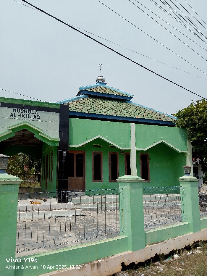 small mosque in Kecamatan Gabuswetan, Indonesia. The mosque is a single-story building with a green exterior and a tiled roof. It has a small dome on top and a sign above the entrance that reads "Musholla Al-Ikhlas". The mosque is surrounded by a chain-link fence and a concrete wall. There are some trees and power lines in the background. The scene is taken from the perspective of someone standing in front of the mosque. There is a small, yellow object in the yard, possibly a piece of trash or a small animal. There is also a white sign in the lower right corner of the image, with the words "VIVO Y19s" and "Akhtar & Arvan 10 Apr 2025, 10:52".