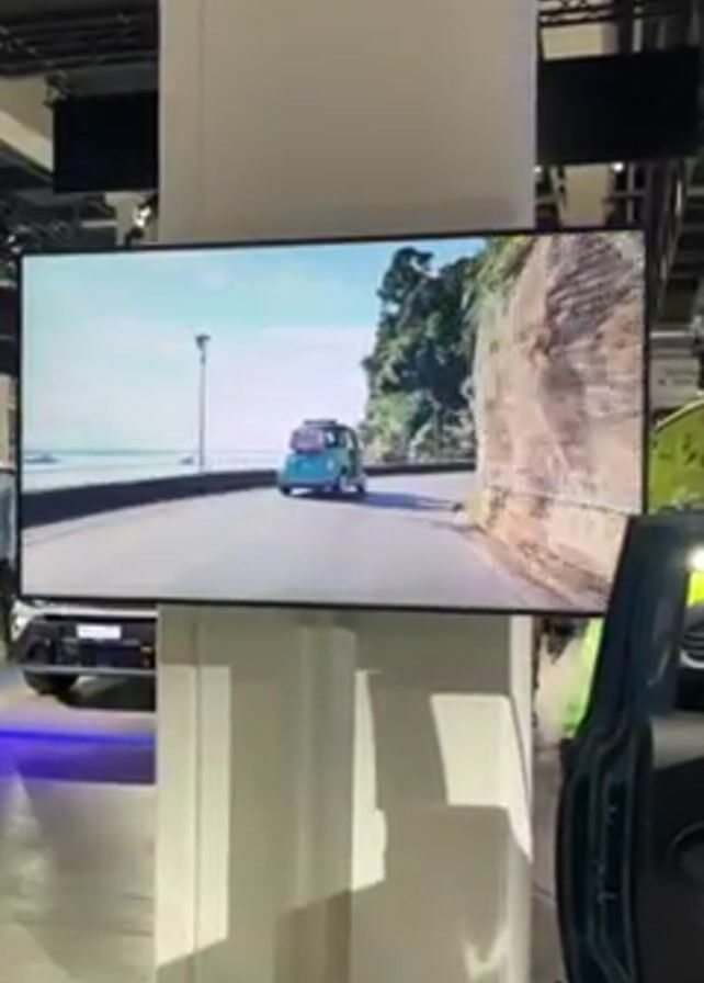 A television screen displays a promotional video of a light blue, electric van driving along a coastal road, in what appears to be a trade show