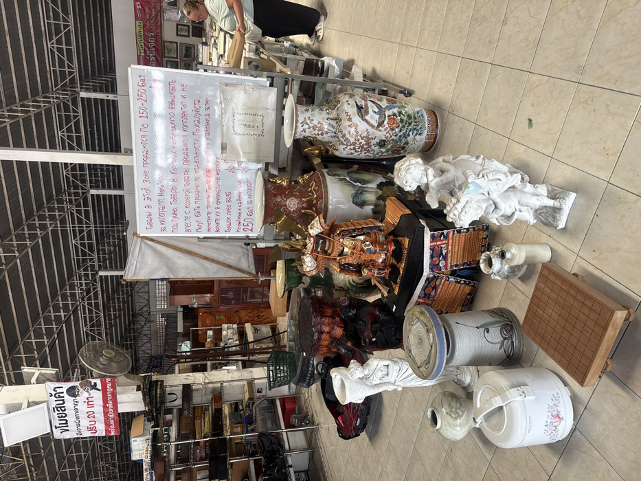 This image depicts an indoor marketplace or warehouse located in Chalong, Thailand. The scene is illuminated by overhead fluorescent lighting, with a metal truss ceiling structure visible. The floor is tiled with light beige squares. In the foreground, a diverse collection of merchandise is arranged directly on the floor. From left to right, these objects include a white electric rice cooker with a floral pattern, a small wooden Go or Weiqi board, a light green glazed ceramic vase, a white classical-style statue of a woman holding a basket, a cylindrical gray ceramic pedestal, a small off-white bottle, and two white classical-style statues of cherubs/putti. Central to the foreground are a dark, possibly carved, wooden stool, a red and gold ornate ceramic vase, and a display of miniature samurai armor set on a dark base. Another large ornate ceramic vase, white with a multi-colored bird and floral motif, stands to the right. In the mid-ground, a white signboard with red Russian text (partially obscured by a transparent sheet) details pricing information, specifying items in this zone are sold for 150-250 baht per kilogram, with an additional "250 baht per kilogram" listed separately. On the right side of the mid-ground, an adult female is visible, positioned behind a metal shelving unit laden with various items. She wears a light green short-sleeved top and dark pants, and appears to be handling or organizing merchandise on a shelf. In the background, multiple metal shelving units are visible, holding a variety of goods, including boxes, furniture, and other household items, indicating a retail or storage environment. A white sign hanging from a ceiling support beam on the left depicts a stylized thief graphic and Thai text, translating to "No Theft / Fine 20 Baht," followed by text indicating legal action. A brown ceiling fan is also mounted overhead.