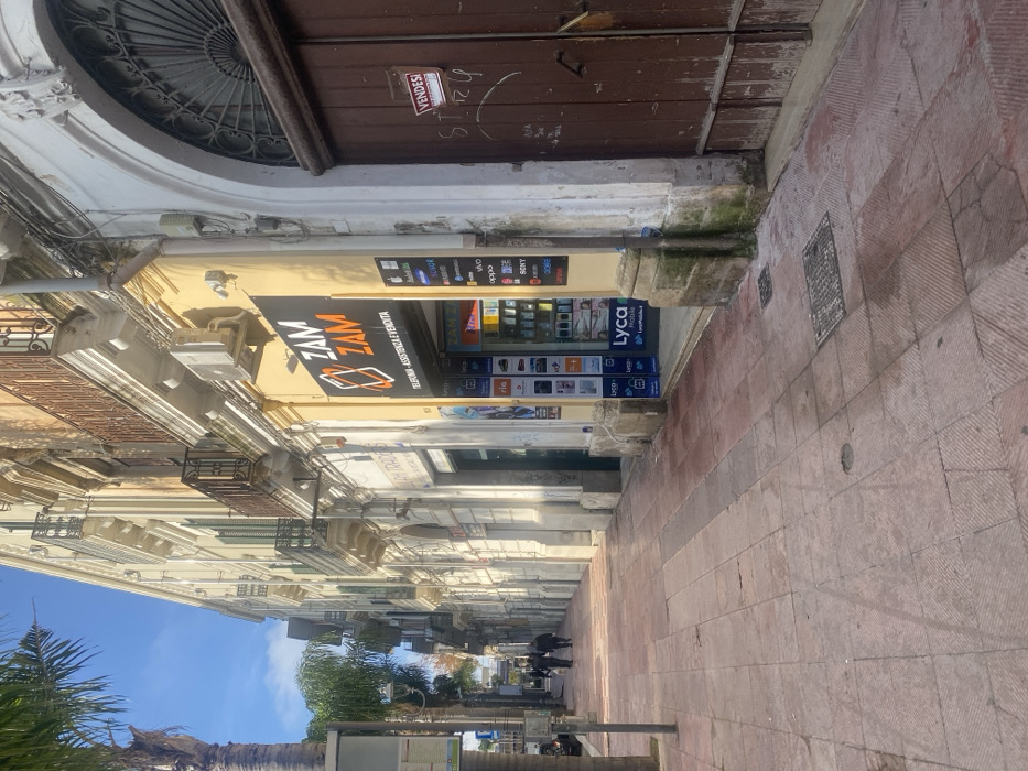 The image captures a sunlit street scene in Brindisi, Italy. A wide sidewalk, paved with reddish-brown rectangular tiles, extends from the foreground into the distance. On the immediate right, a weathered brown wooden double door with an arched top and an ornate metal grill is visible. A red rectangular sign with "VENDESI" (FOR SALE) in white text is affixed to the right door, above white graffiti markings. Adjacent to this door on the left is the storefront of "ZAM ZAM," a mobile phone shop with a prominent yellow facade. The sign reads "ZAM ZAM" with a stylized phone icon, and "TELEFONIA - ASSISTENZA E VENDITA" (Telephony - Assistance and Sales). The store's glass display windows are filled with various mobile phones, accessories, and advertisements for brands like Apple, Huawei, Samsung, Xiaomi, and the telecom provider Lyca Mobile. An outdoor air conditioning unit is mounted on the yellow facade above the store entrance. To the left of the "ZAM ZAM" store, a series of multi-story buildings with light-colored stucco facades, ornate balconies with dark railings, and some windows fitted with dark green shutters line the street. A partially visible sign for "H2O TRADING" is present further down this row of buildings. In the far left foreground, a tall palm tree and a street sign pole with multiple informational panels are visible. In the midground, further down the sidewalk, two individuals, appearing as adult males dressed in dark clothing, are walking away from the camera. The sky above is clear blue with minimal wispy clouds. Sunlight casts distinct shadows to the left, indicating the sun's position to the right of the frame.