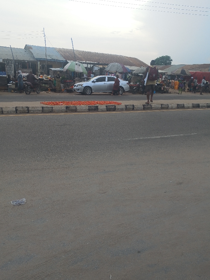 The image displays a street scene in Zango-ndaji, Nigeria, featuring a market adjacent to a road. The foreground shows an asphalt roadway, bordered by a black-and-white striped concrete curb. Directly behind the curb, on a dirt shoulder, approximately one hundred red, round objects, consistent with tomatoes, are spread out. A silver Toyota Corolla sedan is parked facing right on the shoulder, parallel to the market stalls. A person dressed in dark clothing stands near the passenger side of the vehicle. To the left of the sedan, a person is seated on a motorcycle facing left. The background consists of a continuous row of market stalls with corrugated metal roofs and various structures. Several large, light-colored market umbrellas, one green and white striped, provide shade over sections of the market. Numerous individuals are visible throughout the market area, engaged in commercial activities. To the right of the parked car, a person walks away from the camera, carrying a red backpack and a light-colored object over their right shoulder. Utility poles and overhead wires are present against an overcast sky.