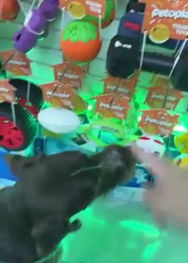 brown dog standing in front of a display of "Petopia Tough Toys" in what looks like a pet store. The toys are hanging on the wall behind the dog, and include items such as balls, chew toys, and toy wheels. The display is lit with green lights. The dog is looking up at the toys, and a person's hand reaches into the frame to touch one of the toys, presumably to see if the dog wants it.
