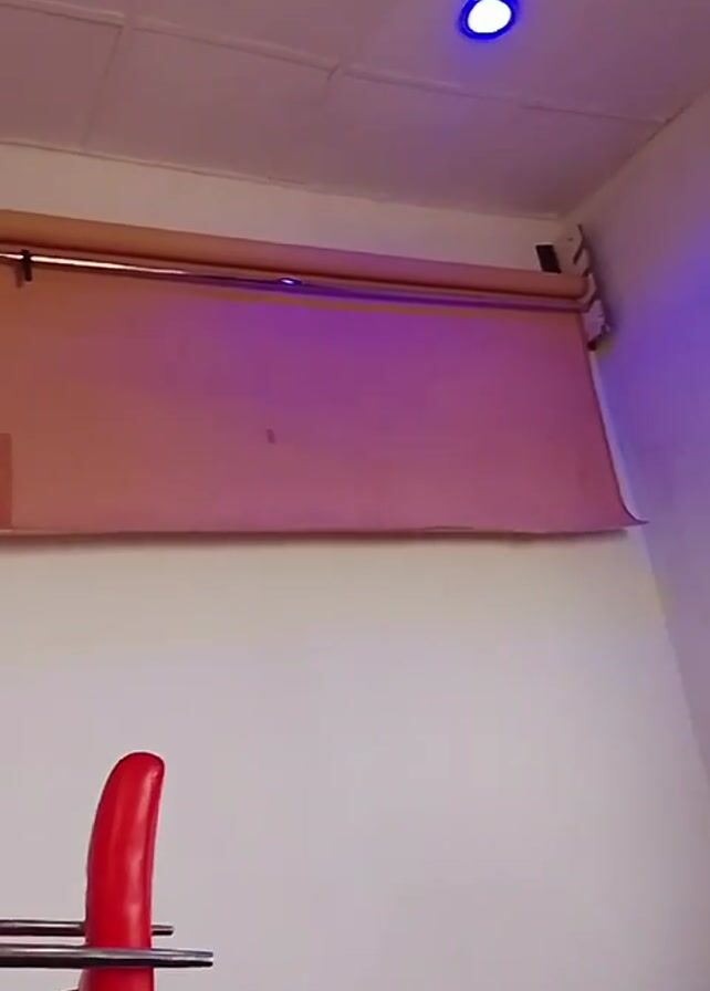A stationary shot focuses on an interior space with a low-angle perspective. A red barstool with chrome arms and footrest is positioned in the foreground. The background consists of a white wall, and a suspended roller blind in a light brown color is hanging close to the ceiling. Two light sources are present on the ceiling: a recessed can light with a white cover and a blue LED light. A dark object partially enters the frame from the left. The overall lighting creates a somewhat sterile and contemporary aesthetic.