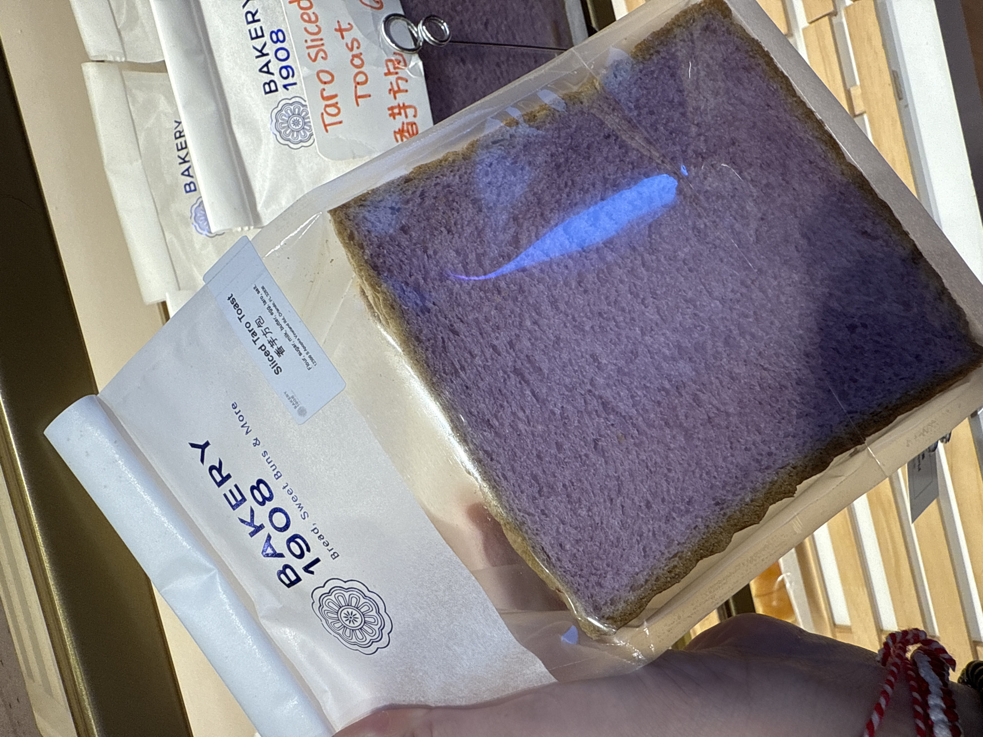 - "A close-up image depicts a human hand holding a package of sliced purple bread, identified as "Sliced Taro Toast" from "BAKERY 1908," inside a retail establishment located at 12399 S Apopka Vineland Road, Orlando, Florida, United States" by FM-HLR6A2, licensed under CC BY 4.0