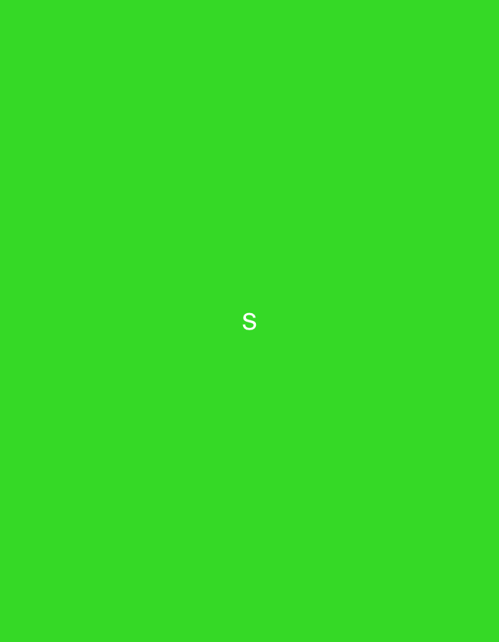 The image is a solid, vibrant green, filling the entire frame. In the very center, a single, lowercase "s" is displayed in a clean, white font. The letter is small relative to the overall image size and positioned precisely in the middle of the green background. The simplicity of the composition emphasizes the stark contrast between the bright green and the white character.