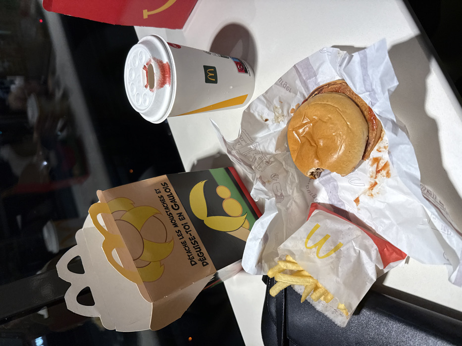 - "A partially consumed McDonald's meal is arranged on a white table surface inside a restaurant, identified as being in Paris, France, due to the French text "DÉTACHE LES MOUSTACHES ET DÉGUISE-TOI EN GAULOIS" on an open Happy Meal box featuring cartoon characters" by FM-w3q4p2, licensed under CC BY 4.0